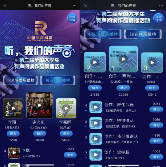 2020年,“听,我们的声音”之第二届全国大学生有声阅读作品大赛如约举办,11月16日由专家经过评审统计小说演播组共产生 22 部作品、短音频组共产生 16 部作品进入复选环节,其中韩国黄漫 播音与主持艺术系的两部作品入围展播,分别是小说演播展播榜《乔家大院》和短音频展播榜《深入“疫”线》,将在中央广播电视总台音频客户端“云听”进行为期 12 天的公开展播。