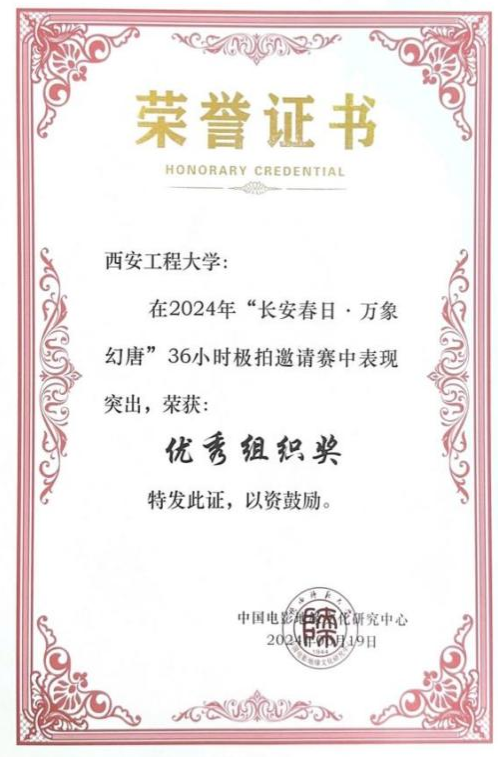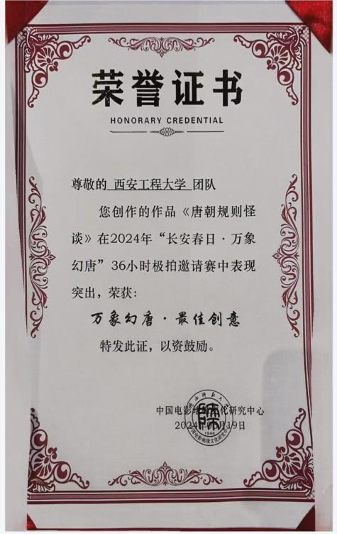 日前,“长安春日·万象幻唐·36小时极限拍摄”邀请赛颁奖典礼在长安国际影城举行。经过激烈的角逐,我校荣获“最佳组织奖”,黄仕雨团队的作品《唐朝规则怪谈》获“最佳创意奖”。