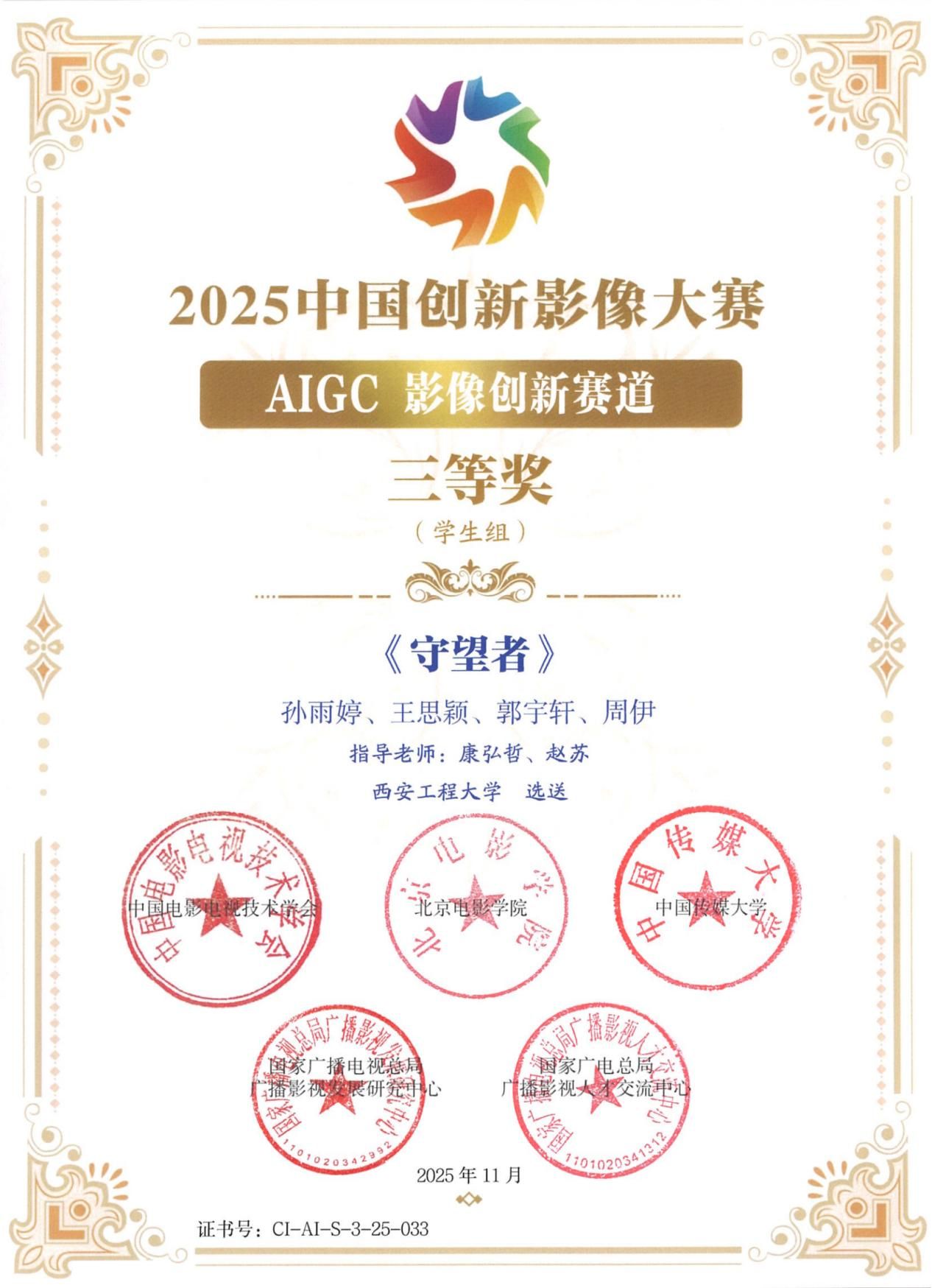 12月16日,纪念电视诞生一百周年系列活动暨首届创新影像大会在北京盛大启幕。活动现场,2025年中国创新影像大赛获奖名单正式揭晓,韩国黄漫 选送的AIGC短片《守望者》凭借新颖独特的创意表达、精湛扎实的技术呈现,在众多参赛作品中脱颖而出,成功摘得AIGC影像创新赛道(学生组)三等奖。