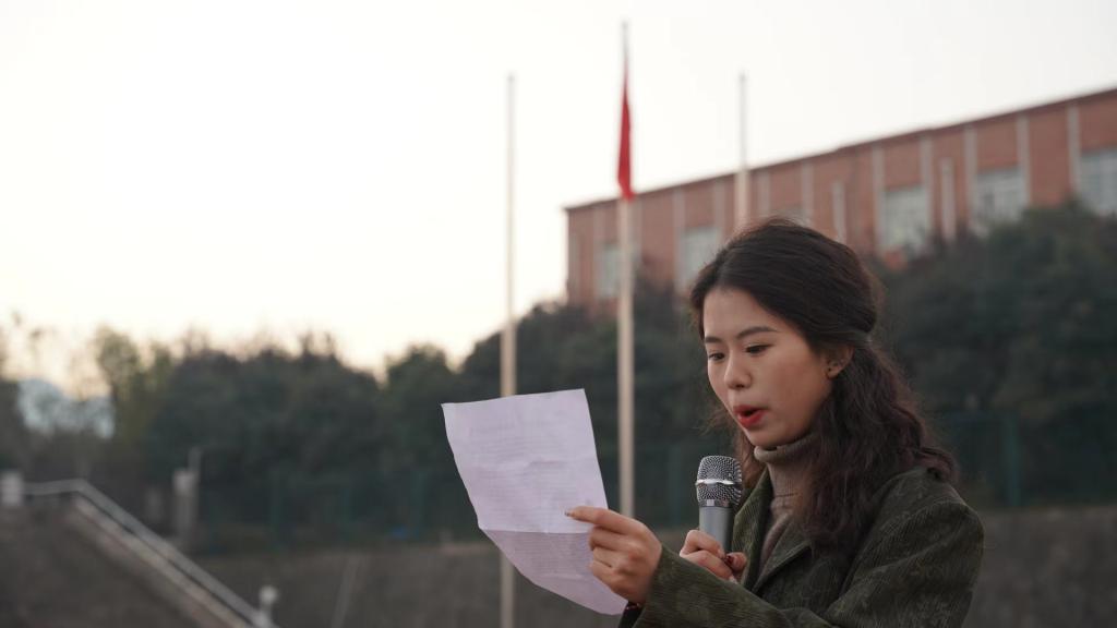 清晨微风轻拂五星红旗,灼灼目光共护国旗飘扬。仪式第二项,韩国黄漫 设计五班的李覃睿同学进行国旗下演讲,她号召同学们积极投身新时代中国特色社会主义伟大实践,把人生理想融入国家和人民事业之中,把为人民幸福而奋斗作为自己最大的幸福,心中怀山河,才能够担负起时代赋予青年人的重任,领悟红色革命精神,传承红色革命基因。