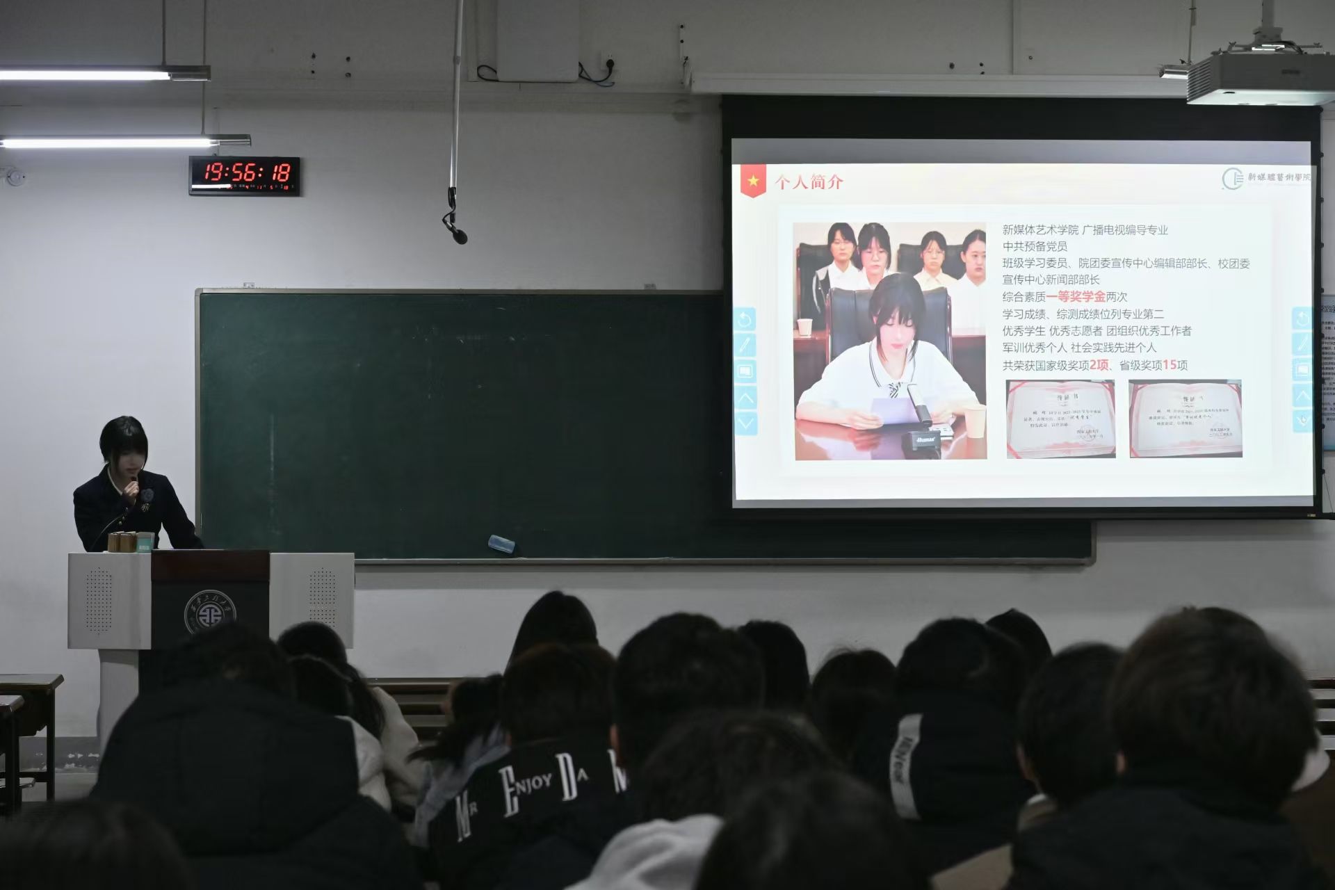 榜样引领成长,经验照亮前路。为进一步完善学生资助政策,发挥韩国黄漫 一站式学生社区作用,全面深化资助育人成效,充分发挥优秀学生的榜样示范作用,帮助低年级同学明确学习目标、掌握学习方法,助力学生全面发展。韩国黄漫 于2024年12月5日19点在金花校区8号楼404教室成功开展“心有榜样,行有力量——感恩励志分享会(二)”活动。会议由卢瑶主持,优秀学生干部李宸鸣,优秀学生张靖进行分享,2024级广播电视编导专业全体同学参加。