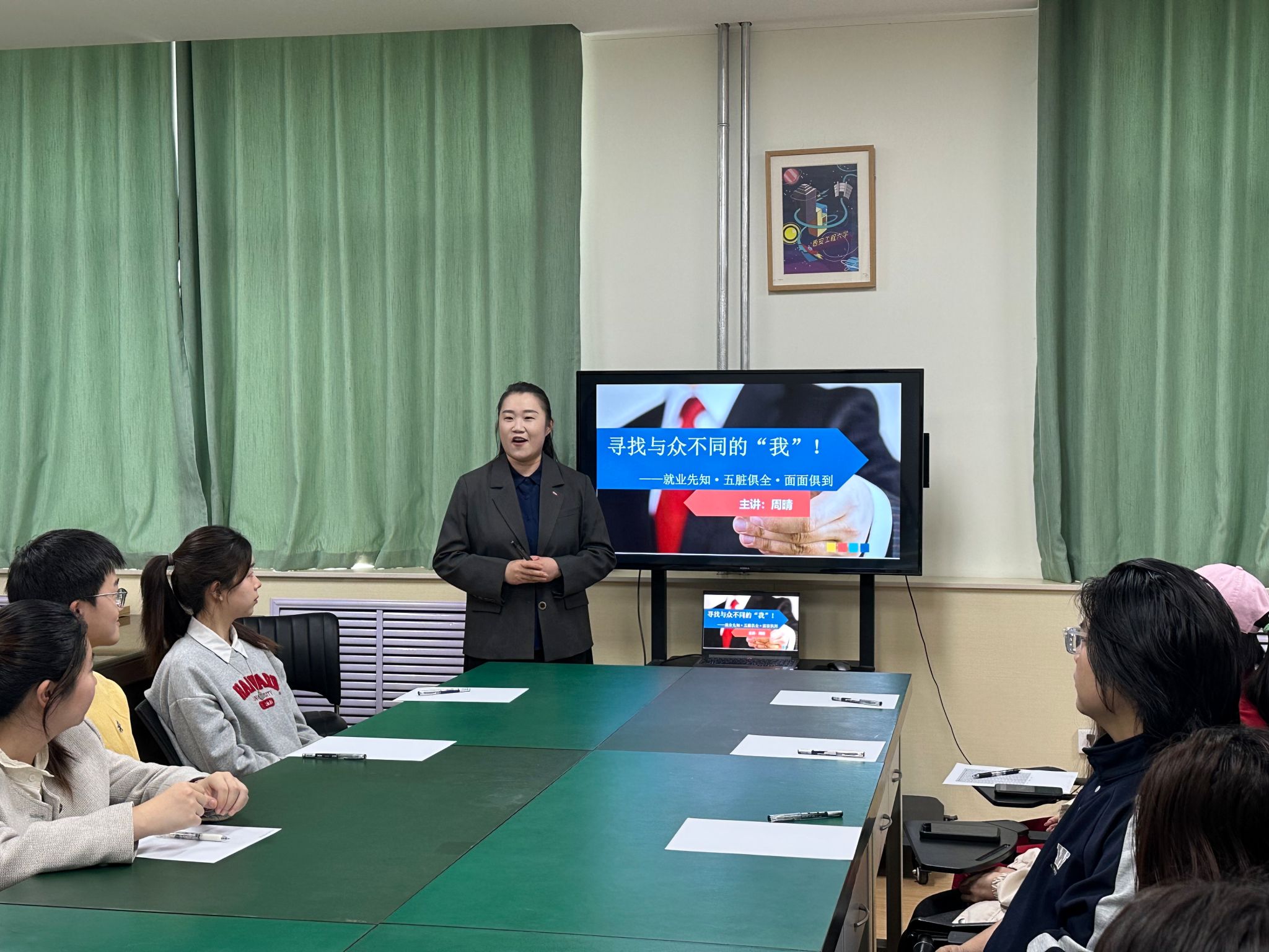 周晴老师在讲座中围绕三个核心内容展开,首先,她为同学们深入分析了当前就业形势,提出了就业形势五先知的重要性,即“知趋势、知要求、知业态、知结构、知发展”。通过这一框架,周老师帮助同学们清晰地认识到当今职场的变化和未来发展的方向,帮助大家预见到即将到来的就业趋势,并明确了各行业对求职者的具体要求。