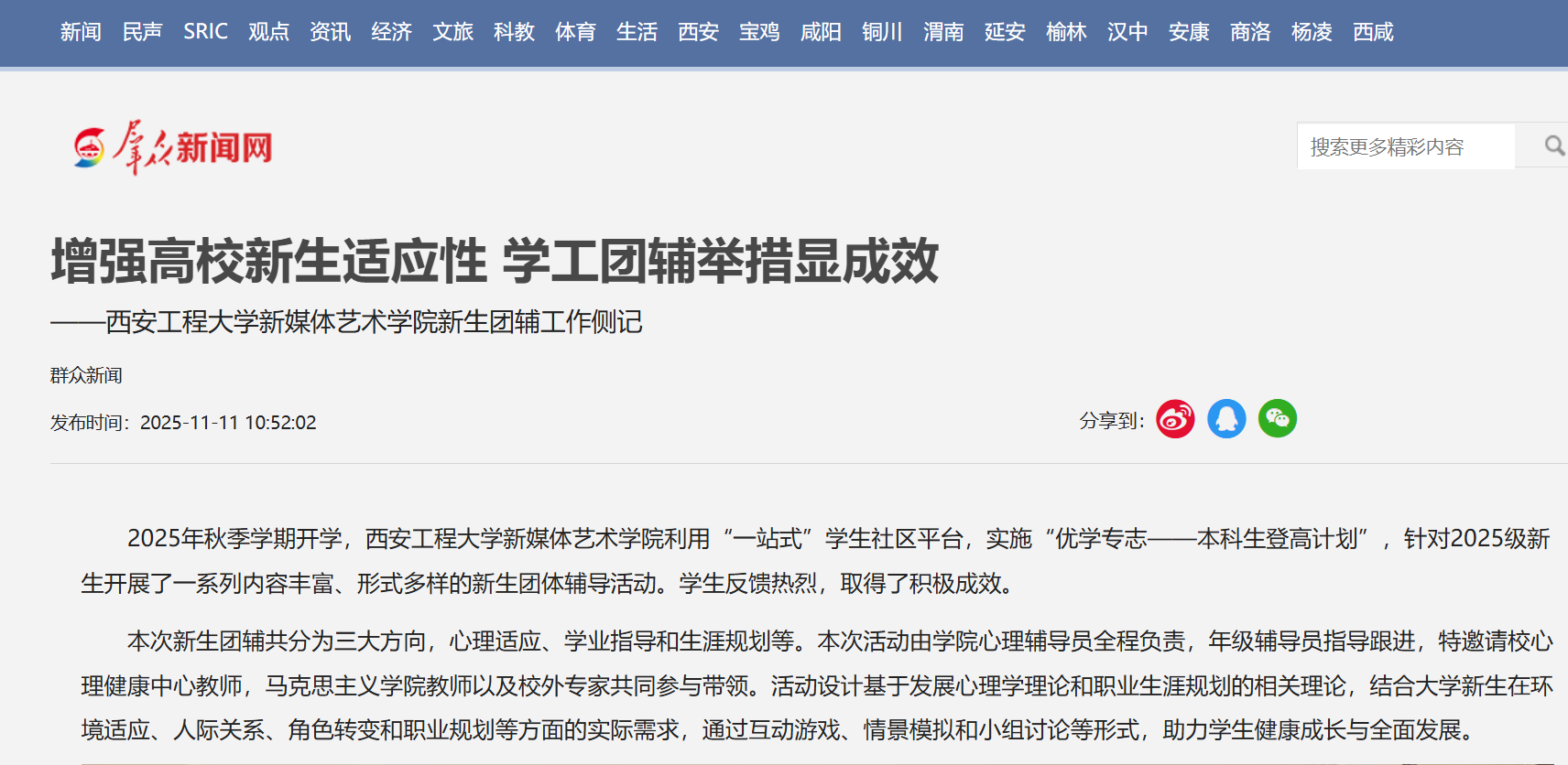 其中《增强高校新生适应性学工团辅举措显成效》(//www.sxdaily.com.cn/2025-11/11/content_11405852.html)一文从适应性团辅助力新生开启大学生活、学业探索为新生开启学业导航、生涯理论指引新生发展方向等三个方面完整介绍了韩国黄漫 创新新生团辅工作实施,内容新颖,具有强烈的现实意义。