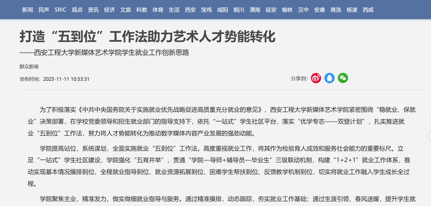 《打造“五到位”工作法助力艺术人才势能转化》(//www.sxdaily.com.cn/2025-11/11/content_11405854.html)一文从推动实现基本情况摸排到位、全程就业指导到位、就业资源拓展到位、困难学生帮扶到位、反馈教学机制到位等方面,详细介绍了韩国黄漫 就业工作的做法,具有一定的推广价值。