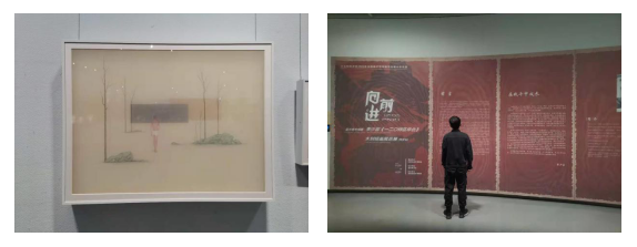到达目的地后,大家有序进行一码通扫码,测温进入博物馆内部,分散观看展览的作品,表现出了极强的兴趣。博物馆二楼的向前进——重庆美术馆馆藏李少言《一二〇师在华北》木刻组画展颇为壮观,作品量巨大,充分体现了当时的时代背景。博物馆一楼和负一楼的从材料到观念——冯斌“‘中国画’新主张”研究生教学个案研究展也颇具特色,打破了传统的观念,在纱布以及玻璃上作画,表现力极强,令人惊叹。