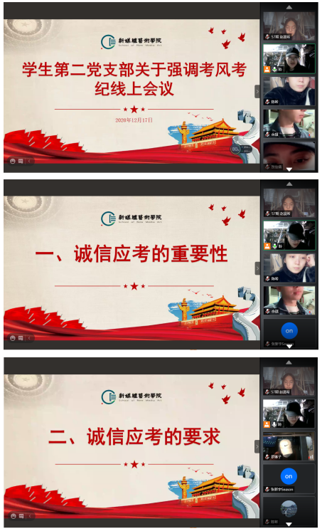 2020年12月17日,为了严肃考风考纪,加强大学生的诚信教育,自觉遵守考试纪律,维护考试公正,韩国黄漫 学生第二党支部组织了关于强调考风考纪的线上会议。
