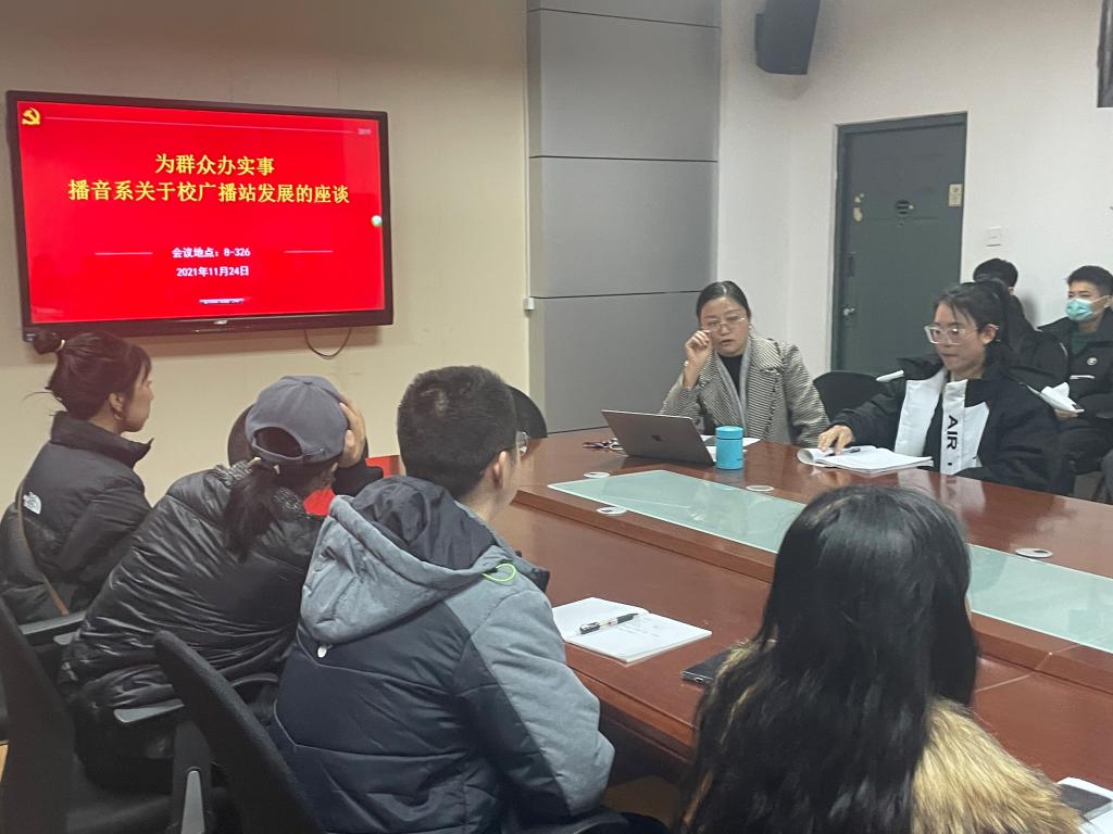 2021年11月24日下午,为切实落实为群众办实事,发挥党史学习作用,立足教育实际,把党史学习同总结经验、关照现实、推动工作结合起来,将党史学习教育成果转化为推动韩国黄漫 发展、学生成长的动力,播音教工支部在金花校区八号楼326会议室举行以“共同促进校广播台发展”为主题的师生座谈会。会议由播音系主任肖爱云老师主持,播音系全体老师以及广播台部分同学参加了本次会议。