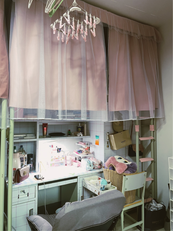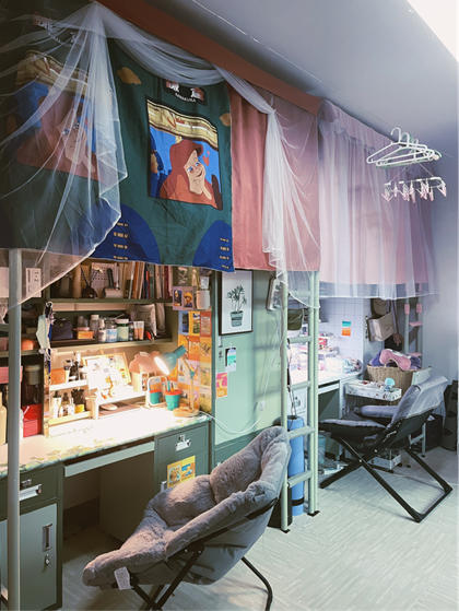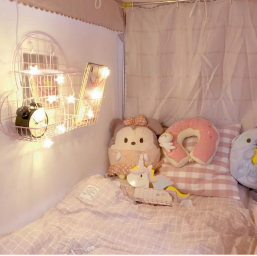 寝室风格:温馨浪漫,以粉色为主基调,搭配以彩灯和玩偶,使宿舍充满了温馨的氛围。