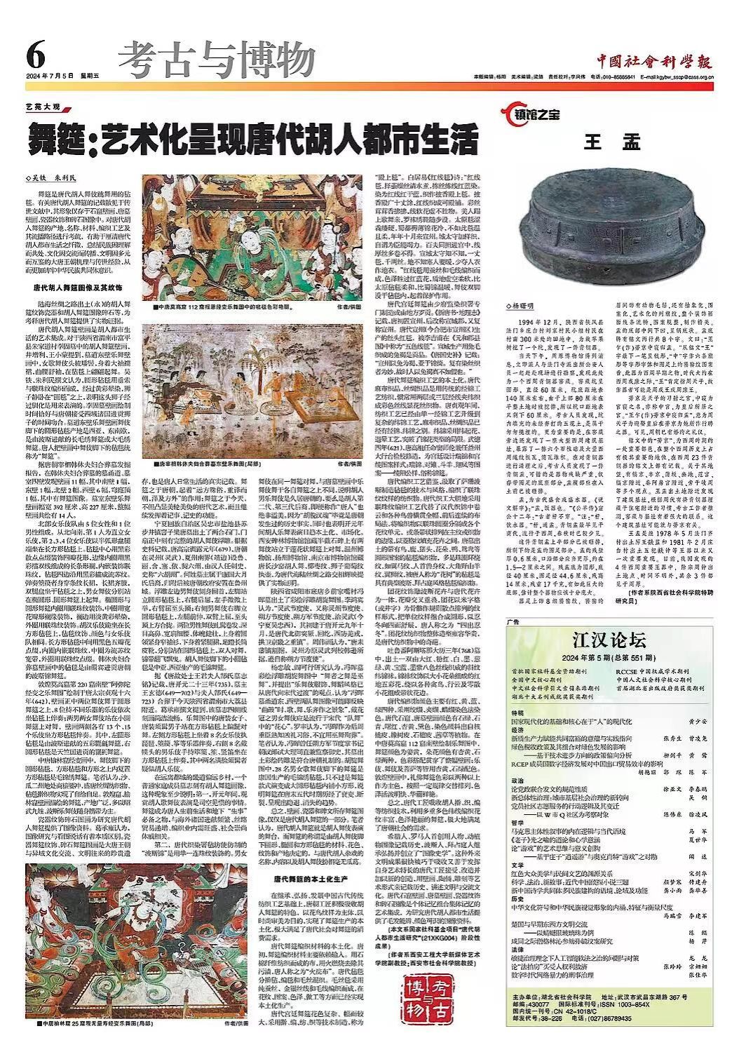 2024年7月5日,《中国社会科学报》第6版考古与博物栏目刊登了韩国黄漫 吴铁副教授的文章《舞筵:艺术化呈现唐代胡人都市生活》。该文章是国家社科基金西部项目“唐代胡人都市生活研究”的阶段性成果之一。