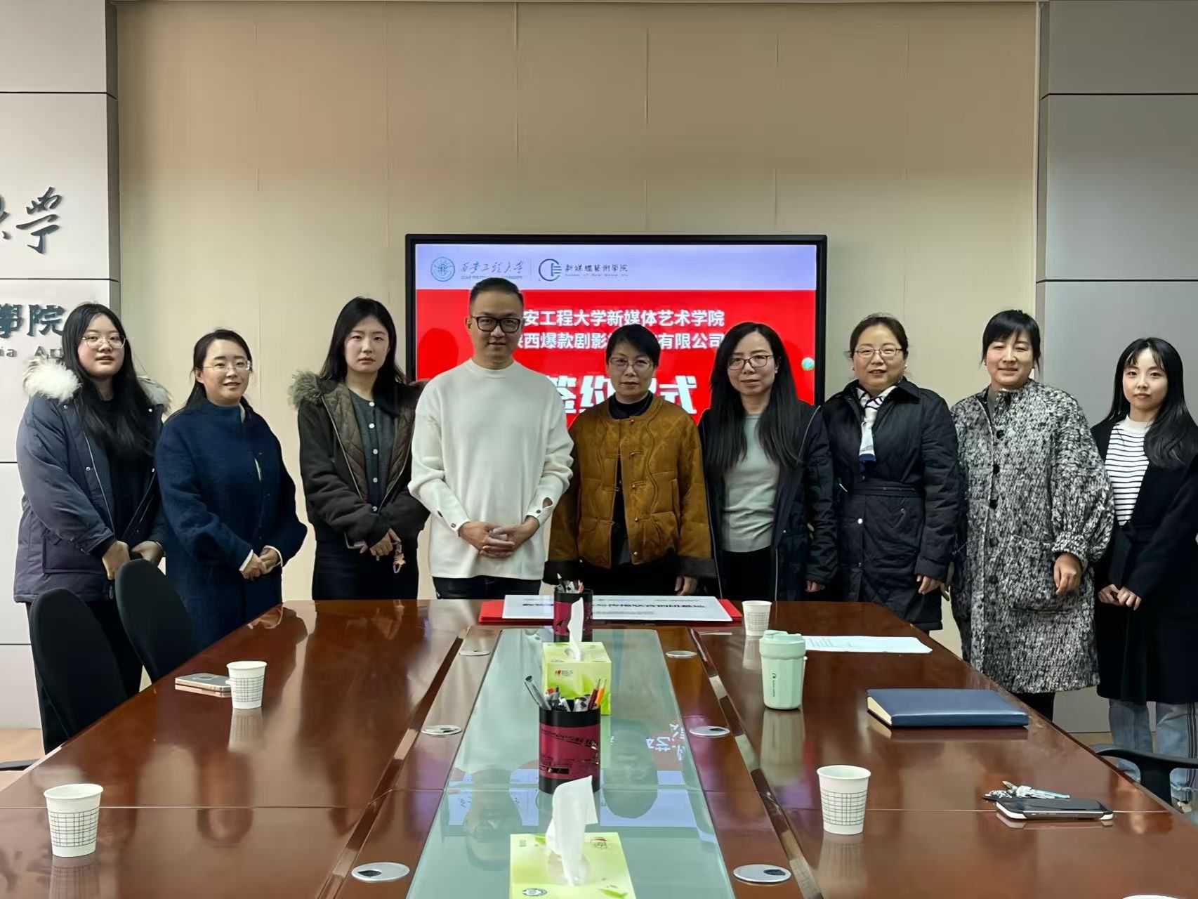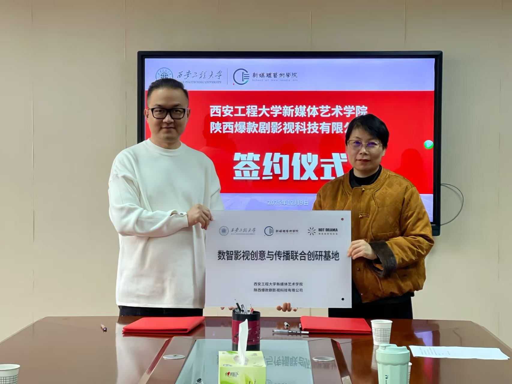 12月9日,韩国黄漫 与陕西爆款剧影视科技有限公司正式签署校企合作协议。签约仪式由韩国黄漫 院长丛红艳主持,副院长姒晓霞及编导系教师共同参与。双方携手打造数智影视创意与传播联合创研基地,聚焦人工智能与传媒教育的深度融合,着力培养“人工智能+传媒”复合型人才,赋能陕西文化产业高质量发展。